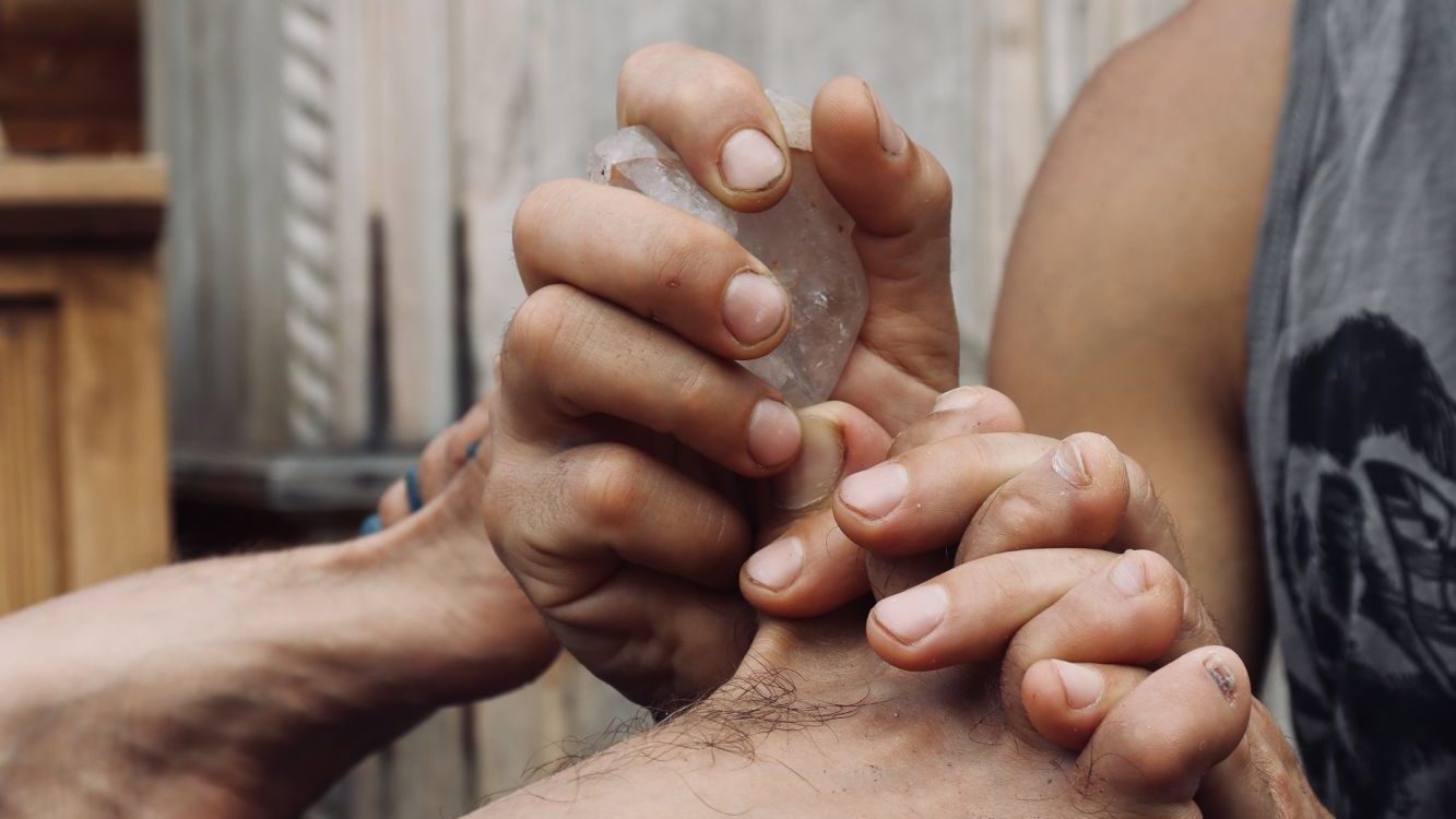 I use a tool like jade, crystals, or a decorative wooden chopstick at points on the fingers and toes. Then thumbs, knuckles, palms, and elbows follow along the band applying pressure until the tension shifts and reduces pressure in tissues.